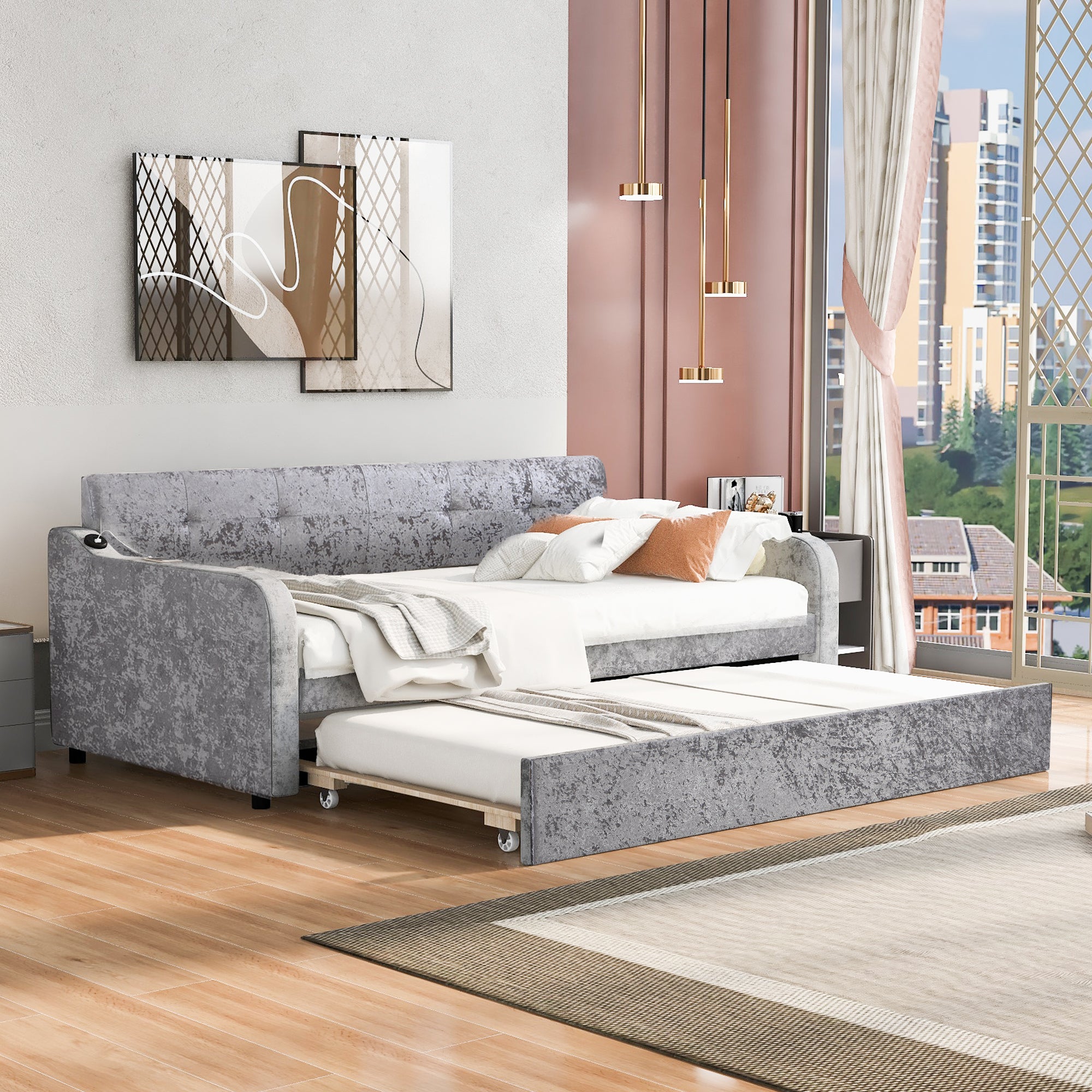 Twin Size Snowflake Velvet Daybed with Trundle and USB Charging Design,Gray