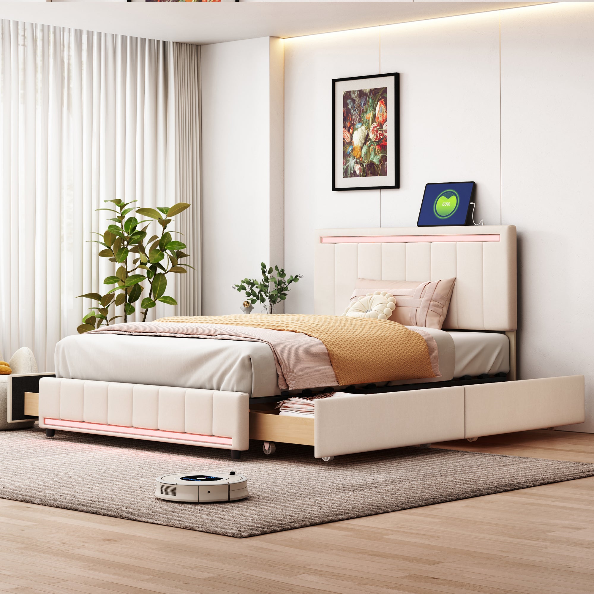 Full Size Upholstered Tufted Daybed with Two Drawers, Beige