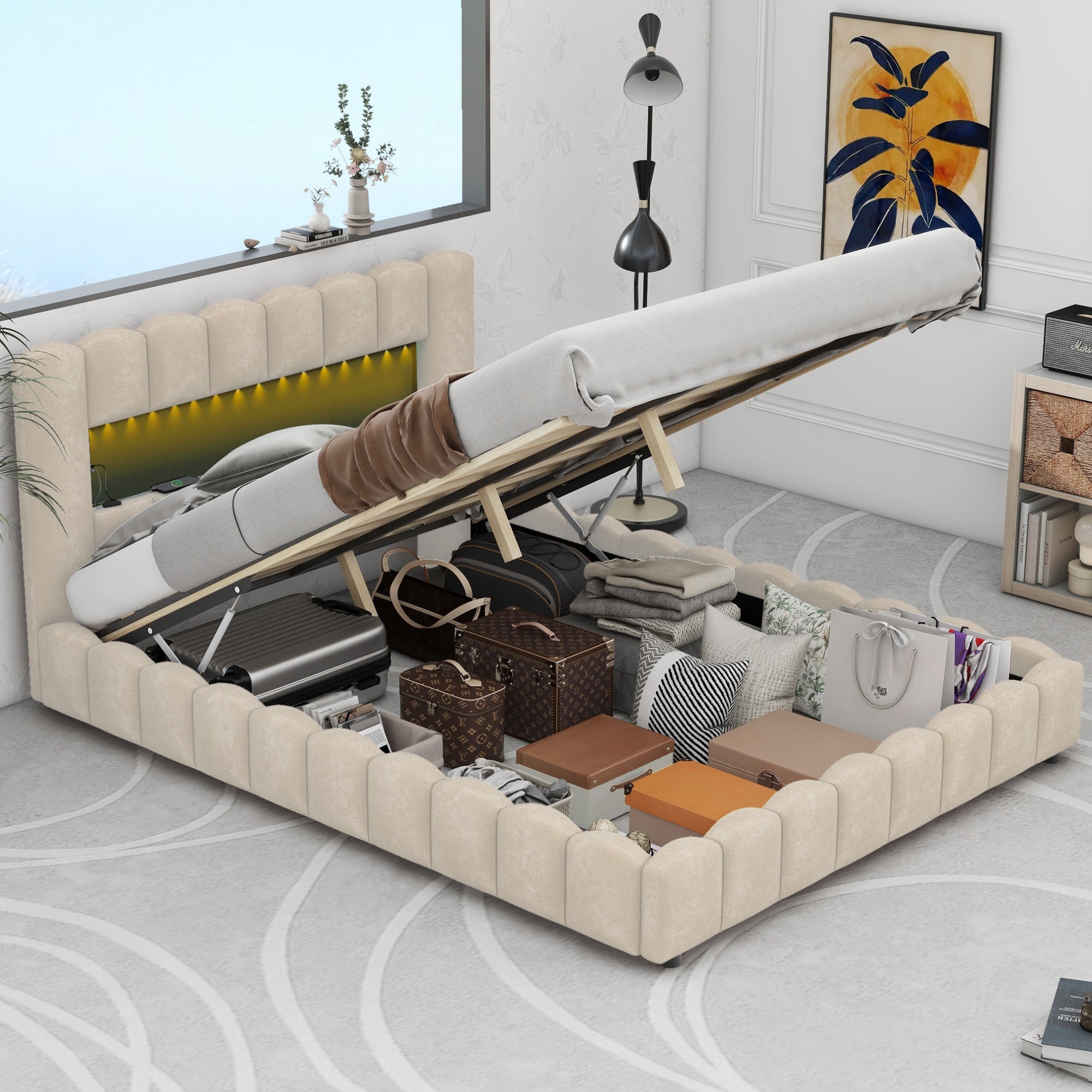 Queen Size Upholstered Platform Bed with LED Headboard and USB, Beige