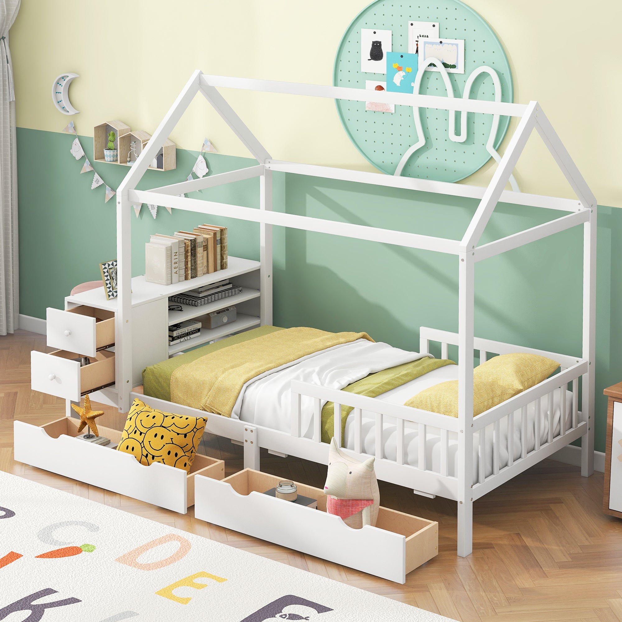 Twin Size House Bed with Fence, Drawers, Shelves and Desk, White